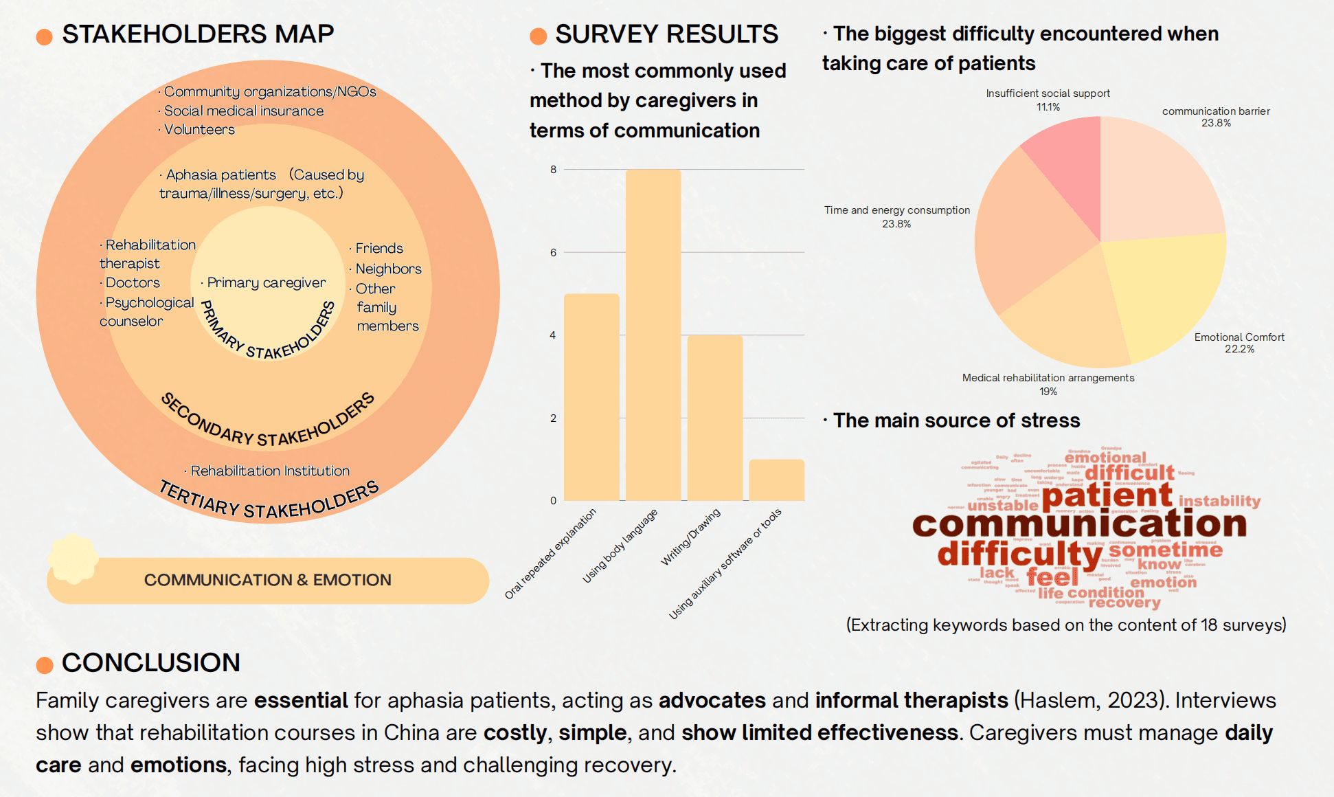 调查显示,照护者最常采用的沟通方式包括重复解释、肢体语言、写字与画图等。但在开放式问卷中,许多人提到这些方式在实际情境中效果并不稳定,常常仍无法准确理解患者的表达需求。在回答的整理中,“沟通困难”是被提及最多的压力来源,其核心来自失语症患者典型的“碎片化表达”——只能说出零散词语或不完整短语,例如反复提到某个物品,却无法说明具体想做什么。由于线索有限,照护者必须不断尝试推断意图,沟通效率随之下降,情绪负担也随之增加。