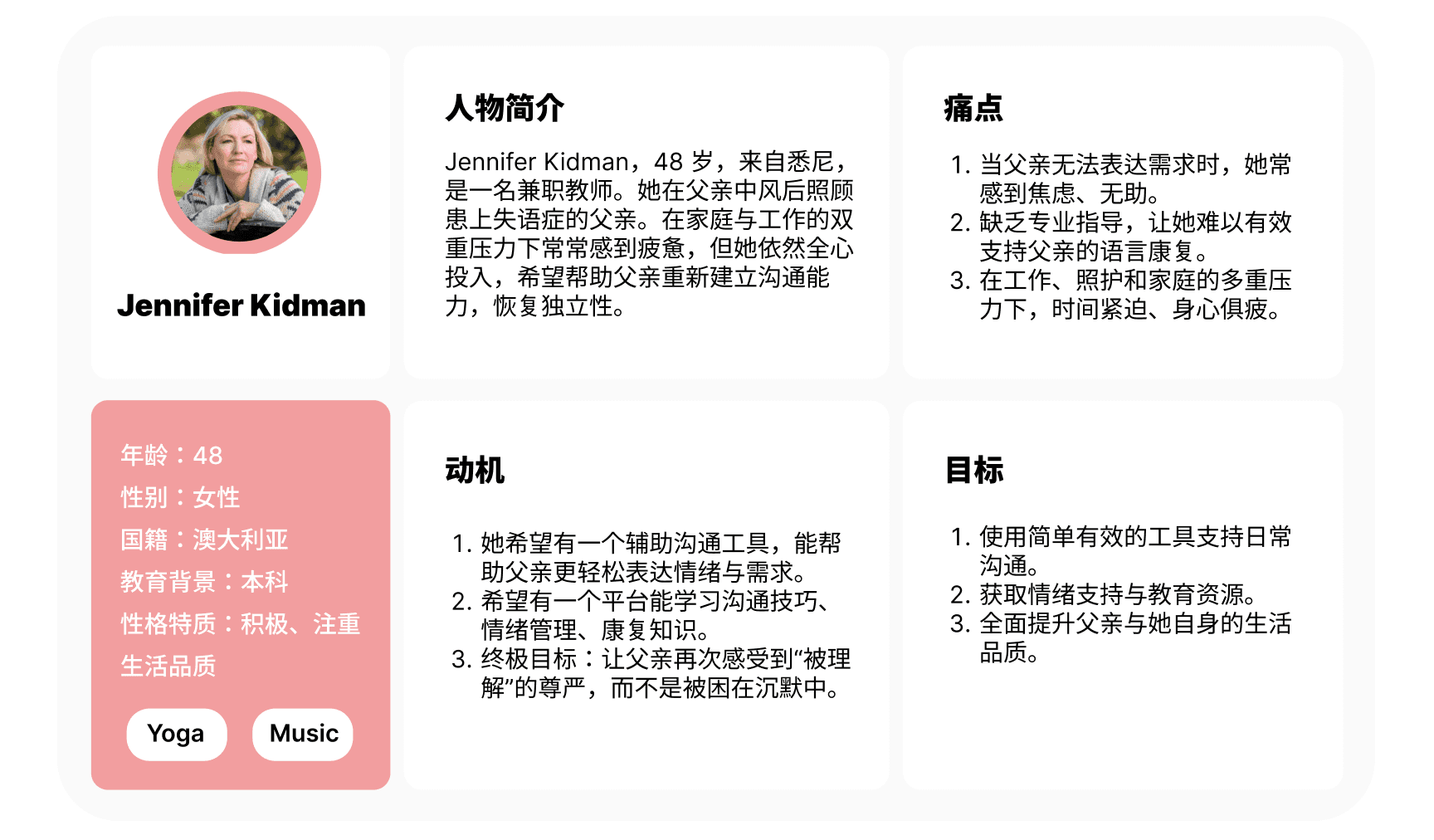 失语症是一种因脑损伤而产生的语言障碍,常见于中风、外伤或手术之后。患者的思维依然清晰,但语言处理能力受损,日常交流会出现说话不清晰、难以表达完整句子、理解困难、词语遗忘,或看到物体却叫不出名字等情况。在澳大利亚约有 14 万名失语症患者,全球更是数以百万计。多数照护工作由女性家庭成员承担,她们需要在家务之外,处理沟通协调、情绪支持与日常照护。然而由于缺乏专业医学知识,加之失语症通常突发,家庭沟通常处在高压力与不确定性中。本项目由此切入,探索如何在非专业医疗环境下支持照护者与患者之间的沟通与情感连接,从而减轻双方压力,提高日常生活质量。